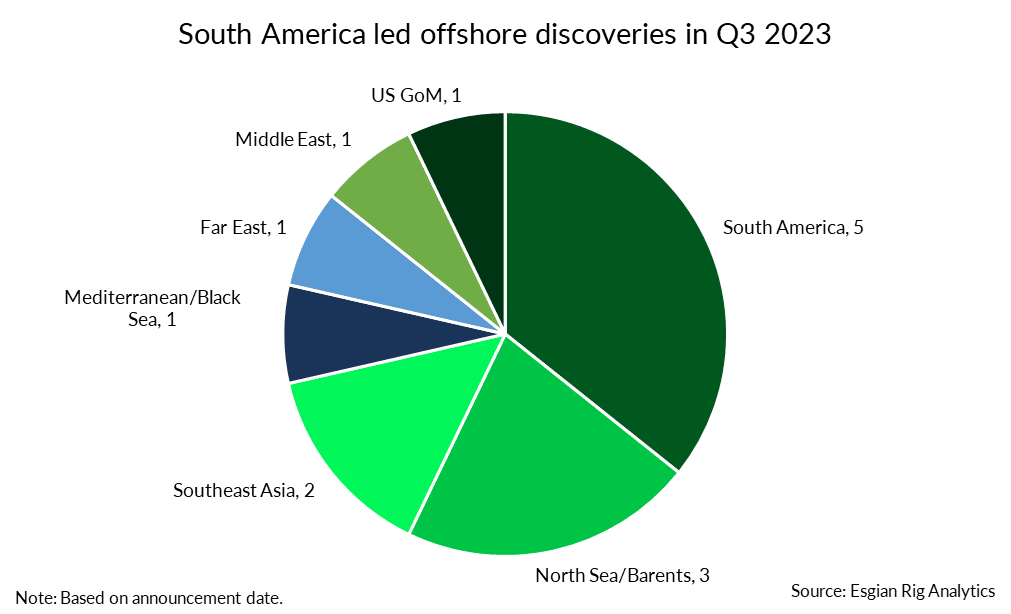 Fourteen discoveries across seven offshore regions were announced in the third quarter of this year, according to Esgian’s Well Results dataset. By region, South America was the leader with about one-third of the discoveries announced or confirmed during the quarter.