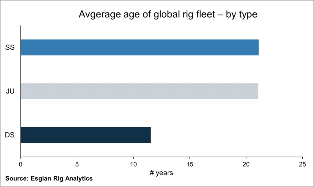 The average age of the global rig fleet varies by type, which influences contractors’ strategies in the current cycle. The average age of jackup as well as semisubmersible fleets is around 21 years, indicating a mature fleet that may require replacements or upgrades at some point in the future.