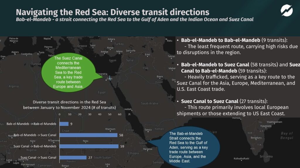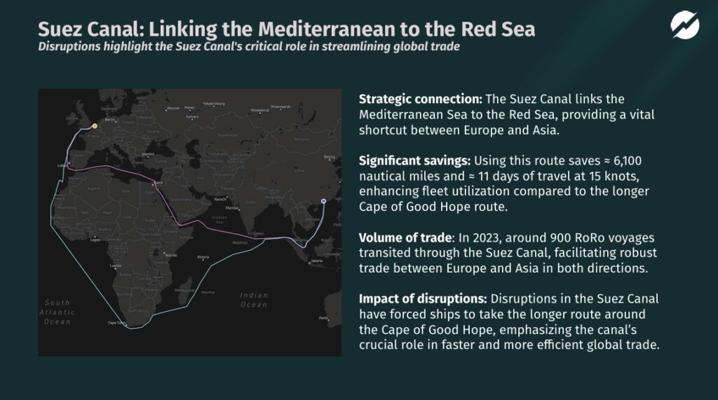 - Decline in Suez Canal traffic: Geopolitical tensions and security risks in the Red Sea have drastically reduced canal usage since November 2023.